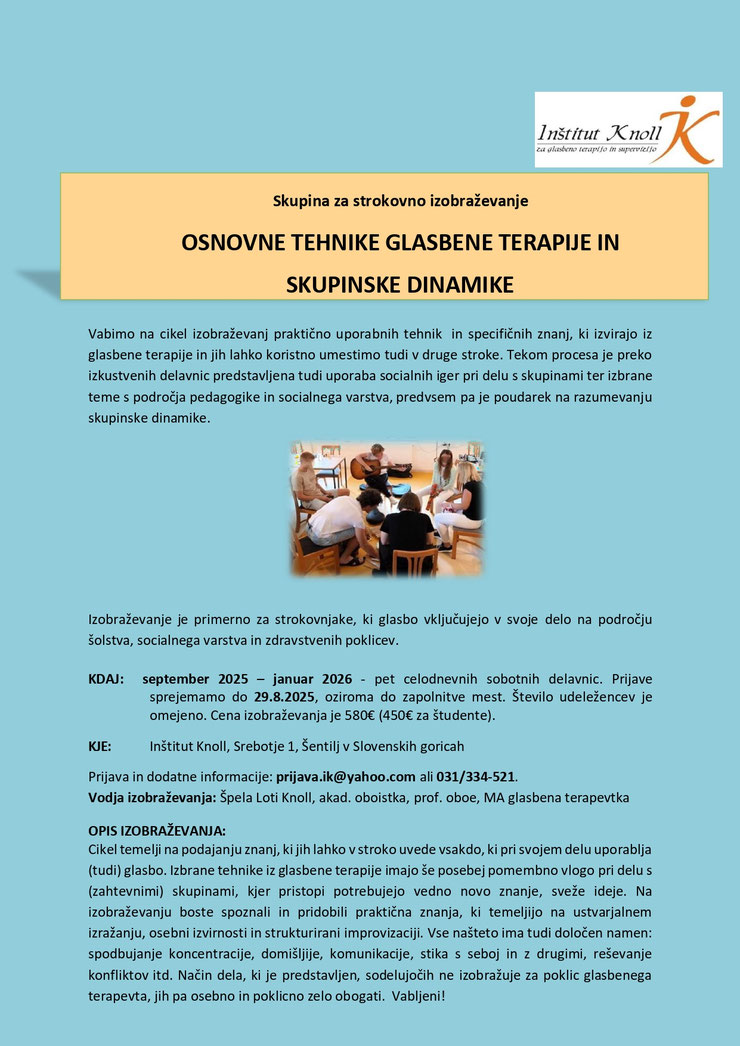 IK - Inštitut Knoll za glasbeno terapijo in supervizijo, ustanovljen septembra 2014 v Kranju, od leta 2019